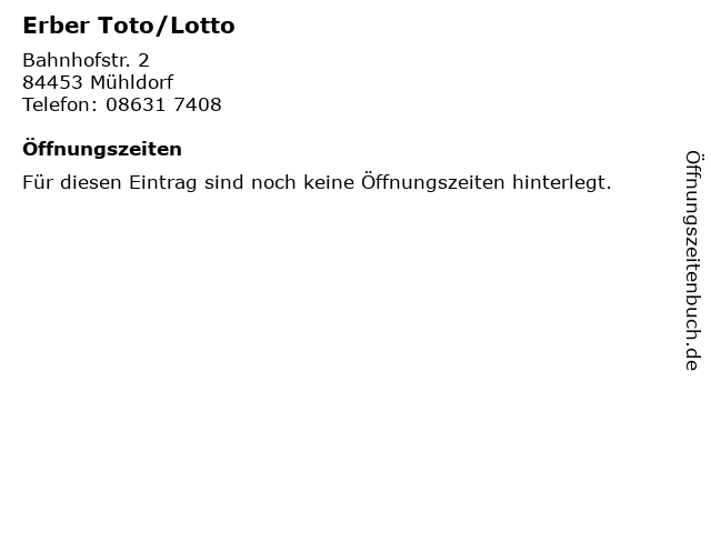 | Öffnungszeiten Erber Toto/Lotto in Mühldorf anzeigen | |
