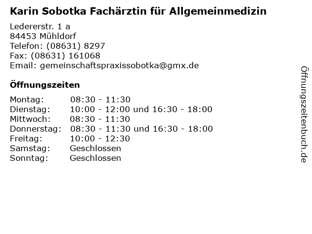 1 Günter Rosenberger & Karin Zieglgänsberger Rechtsanwälte (Entfernung: 0,17 km) Stadtplatz 79, 84453 Mühldorf 3 Dr. Ana-Maria Drieschner, Fachärztin für Allgemeinmedizin (Entfernung: 1,64 km) Egglkofenstraße 9-11, 84453 Mühldorf 4 Waltraud Wohllaib Fachärztin für Anästhesiologie (Entfernung: 2,32 km) Philipp-Reis-Str. 5, 84453 Mühldorf 5 Dr.med. Manuela Zabinski-Sarbu Fachärztin für Kinder- und Jugendmedizin (Entfernung: 9,83 km) Berliner Str. 15, 84478 Waldkraiburg 6 RADIO-LOG Allgemeinmedizin Medizinisches Versorgungszentrum - Dr. med. Kirsten Eckhardt - Fachärztin für Allgemeinmedizin (Entfernung: 11,19 km) Vinzens-von-Paul-Straße 8-10, 84503 Altötting |