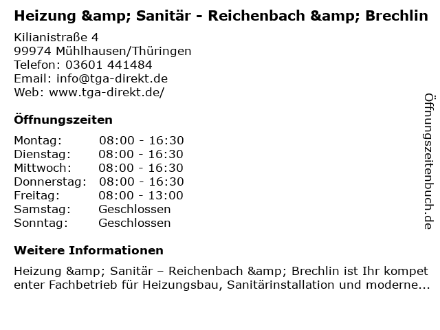 1 Reichenbach & Brechlin GbR Lüftungs- und Heizungsbau (Entfernung: 0,00 km) Kilianistr. 4, 99974 Mühlhausen 6 |