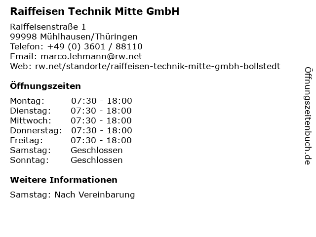 1 RWZ Technik-Center Weinbergen-Bollstedt (Entfernung: 0,62 km) Raiffeisenstraße 1, 99998 Weinbergen-Bollstedt 6 Raiffeisen-Warenzentrale Kurhessen-Thüringen GmbH RWZ Lagerhaus Großengottern (Entfernung: 6,88 km) Mülverstedter Str. , 99991 Großengottern |