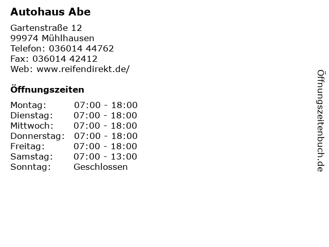 | Öffnungszeiten Autohaus Abe in Mühlhausen anzeigen | |