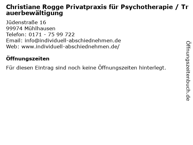 | Christiane Rogge Privatpraxis für Psychotherapie / Trauerbewältigung anrufen | |