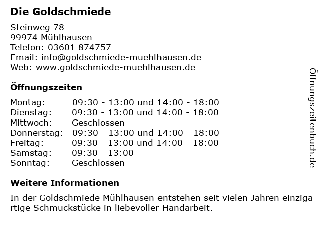 Öffnungszeiten Die Goldschmiede in Mühlhausen anzeigen | |