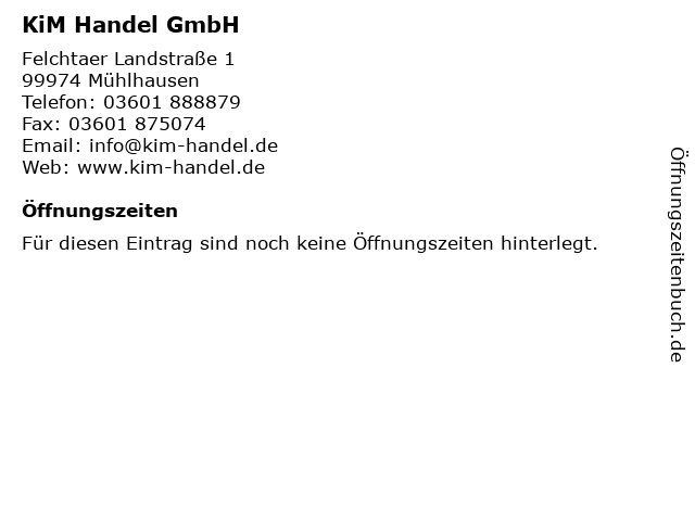 | Öffnungszeiten KiM Handel GmbH in Mühlhausen anzeigen | |