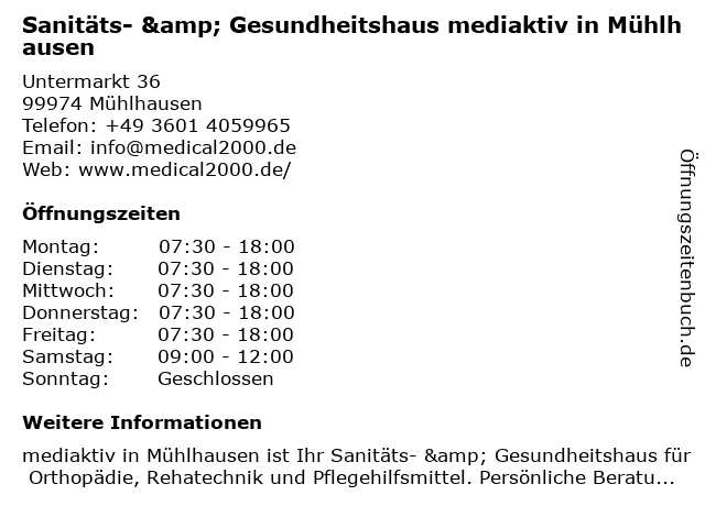 6 Sanitäts- & Gesundheitshaus mediaktiv in Gotha/Siebleben (Entfernung: 34,92 km) Weimarer Straße 58, 99867 Gotha |
