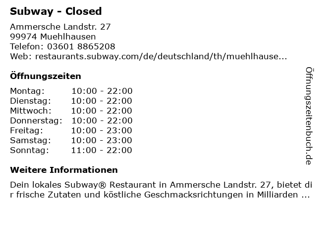 | Öffnungszeiten Subway - Closed in Muehlhausen anzeigen | |