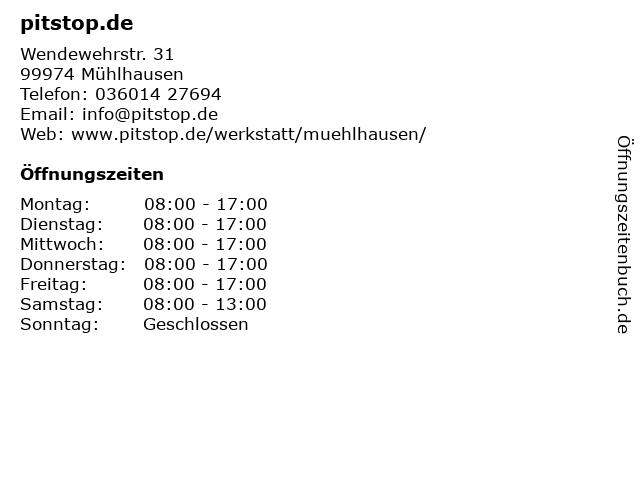 | Öffnungszeiten pitstop.de in Mühlhausen anzeigen | |