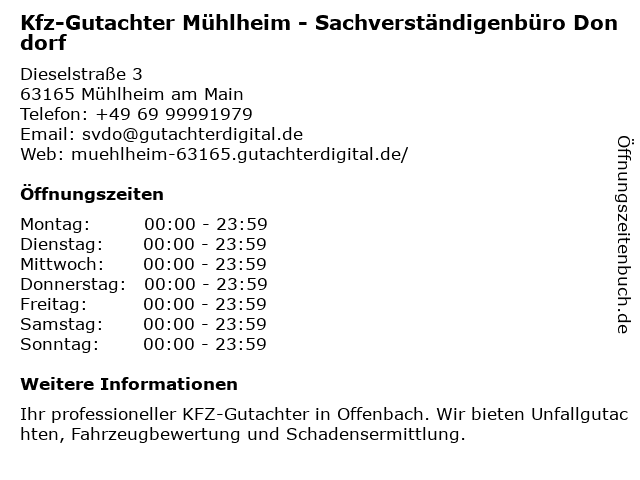 1 Kfz-Gutachter Offenbach - Sachverständigenbüro Dondorf (Entfernung: 0,00 km) Dieselstraße 3, 63165 Offenbach 4 Kfz Gutachter / KFZ Sachverständiger - GC Gutachter (Entfernung: 1,14 km) Dietesheimer Str. 9, 63165 Mühlheim am Main 6 |