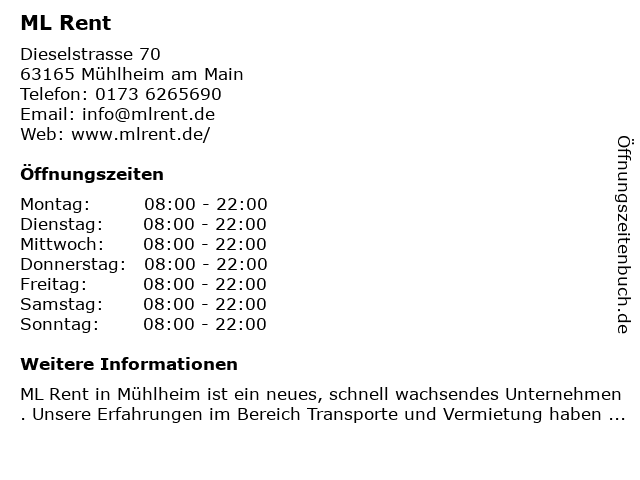 | Öffnungszeiten ML Rent in Mühlheim am Main anzeigen | |