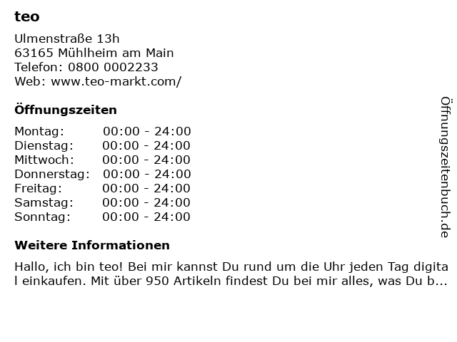 | Öffnungszeiten teo in Mühlheim am Main anzeigen | |