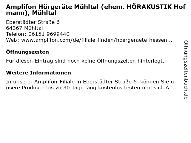 | Amplifon Hörgeräte Mühltal (ehem. HÖRAKUSTIK Hofmann), Mühltal anrufen | |