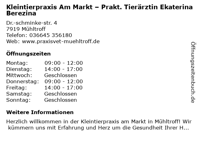 Branchen & Suchbegriffe zu Kleintierpraxis Am Markt – Prakt. Tierärztin Ekaterina Berezina:berezina, ekaterina, kleintierpraxis, markt, prakt., tierärztin, – |