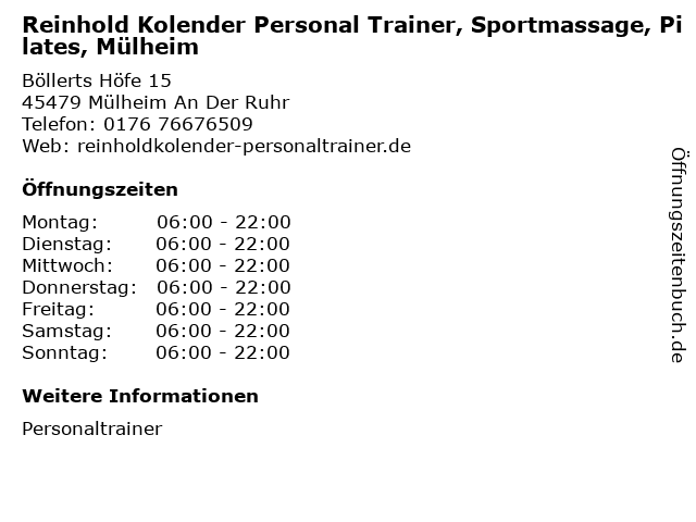 Branchen & Suchbegriffe zu Reinhold Kolender Personal Trainer, Sportmassage, Pilates, Mülheim:kolender, personal, physiotherapie, pilates, psychotherapie, reinhold, sportmassage, trainer |