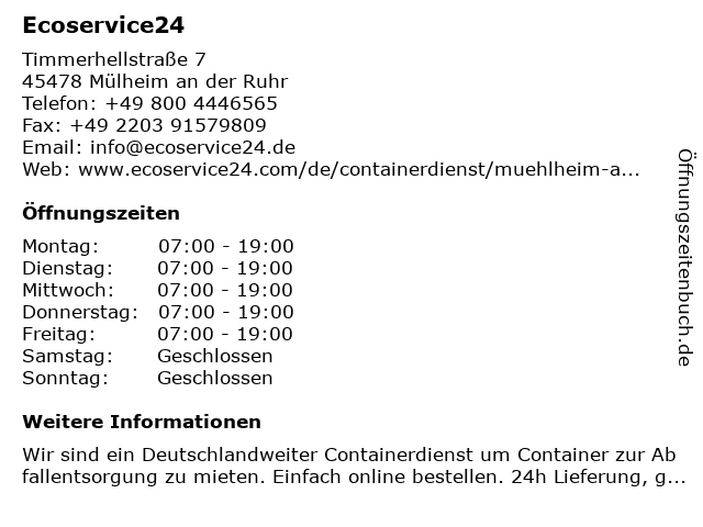 | Öffnungszeiten Ecoservice24 in Mülheim an der Ruhr anzeigen | |