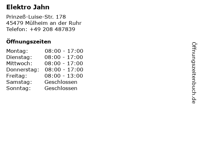 | Öffnungszeiten Elektro Jahn in Mülheim an der Ruhr anzeigen | |