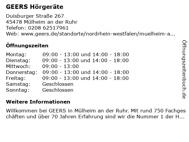| Öffnungszeiten GEERS Hörgeräte in Mülheim an der Ruhr anzeigen | |