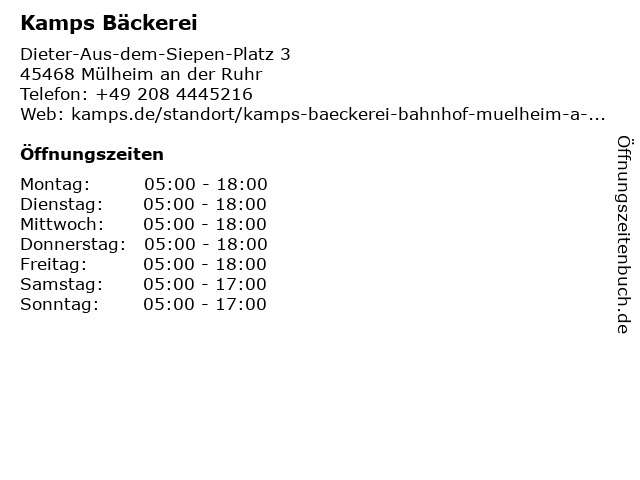 | Öffnungszeiten Kamps Bäckerei in Mülheim an der Ruhr anzeigen | |
