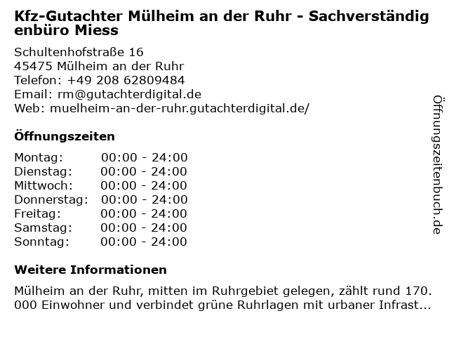 1 Sachverständigen- & Ingenieurbüro Tas - KFZ Gutachter Mülheim (Entfernung: 1,34 km) Schildberg 72, 45475 Mülheim 4 KPSR KFZ Prüf- & Sachverständigenbüro Rhein - Ruhr GmbH (Entfernung: 2,41 km) Aktienstraße 34, 45473 Mülheim 6 Walter Heine KFZ-Sachverständigenbüro (Entfernung: 3,80 km) An der Seilfahrt 12, 45472 Mülheim An Der Ruhr |