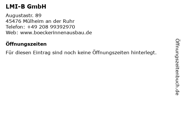 | Öffnungszeiten LMI-B GmbH in Mülheim an der Ruhr anzeigen | |