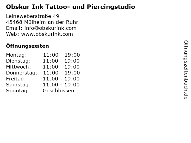 | Öffnungszeiten Obskur Ink Tattoo- und Piercingstudio in Mülheim an der Ruhr anzeigen | |