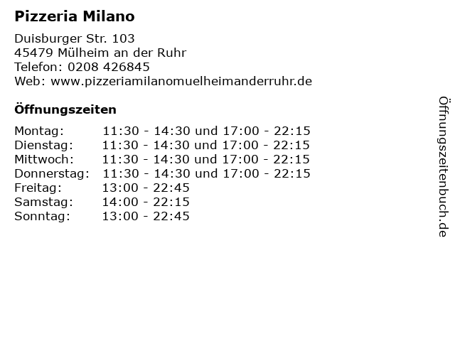 | Öffnungszeiten Pizzeria Milano in Mülheim an der Ruhr anzeigen | |