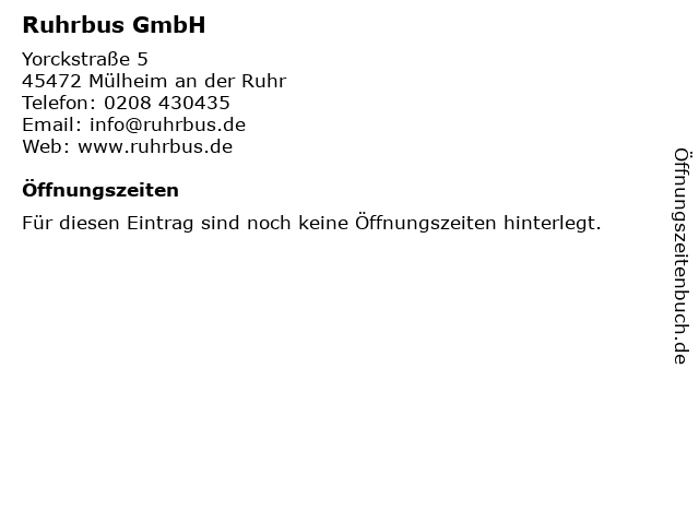 | Öffnungszeiten Ruhrbus GmbH in Mülheim an der Ruhr anzeigen | |