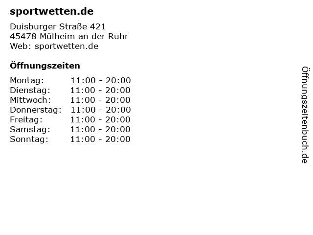 | Öffnungszeiten sportwetten.de in Mülheim an der Ruhr anzeigen | |