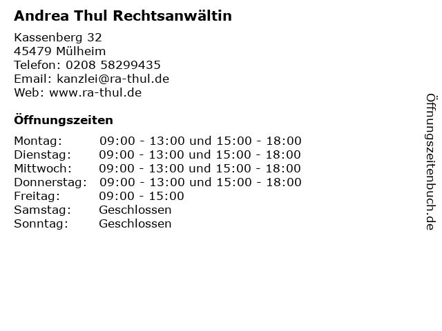 | Öffnungszeiten Andrea Thul Rechtsanwältin in Mülheim anzeigen | |