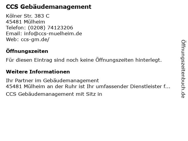 | Öffnungszeiten CCS Gebäudemanagement in Mülheim anzeigen | |