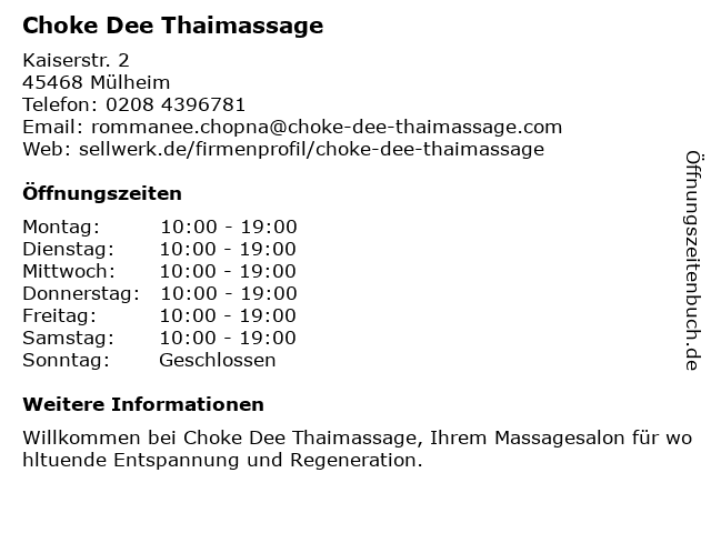 | Öffnungszeiten Choke Dee Thaimassage in Mülheim anzeigen | |