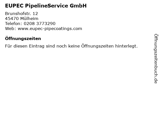| Öffnungszeiten EUPEC PipelineService GmbH in Mülheim anzeigen | |