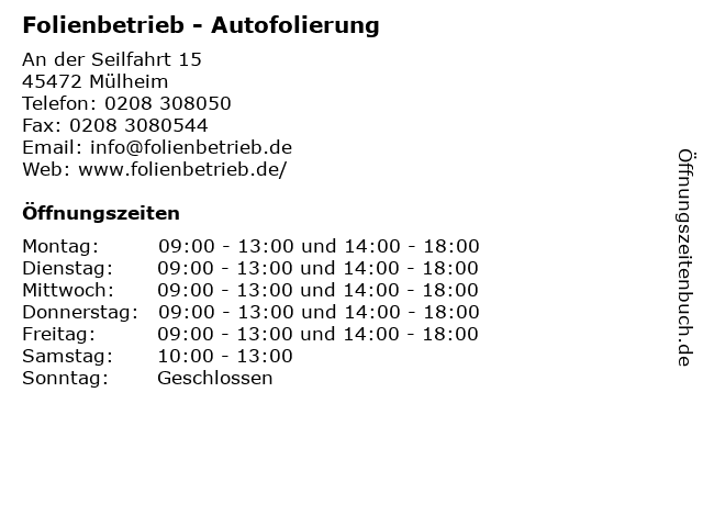 | Öffnungszeiten Folienbetrieb - Autofolierung in Mülheim anzeigen | |