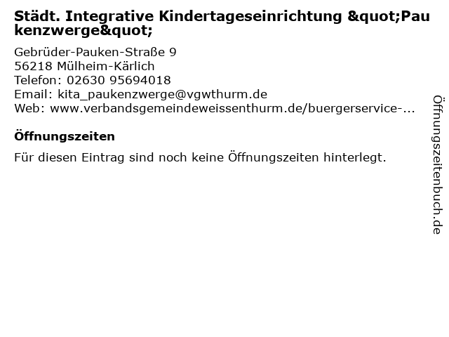 | Städt. Integrative Kindertageseinrichtung "Paukenzwerge" anrufen | |