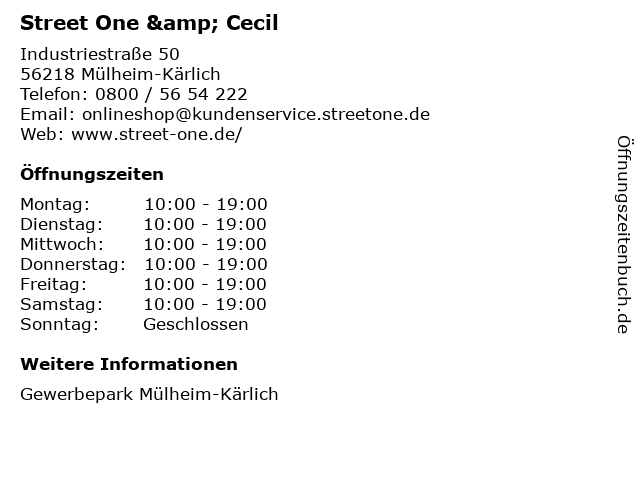 | Öffnungszeiten Street One & Cecil in Mülheim-Kärlich anzeigen | |