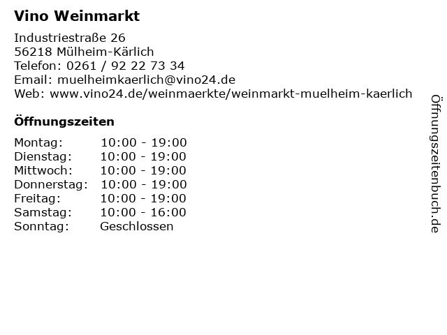 | Öffnungszeiten Vino Weinmarkt in Mülheim-Kärlich anzeigen | |
