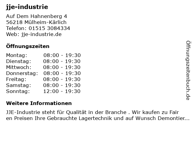 | Öffnungszeiten jje-industrie in Mülheim-Kärlich anzeigen | |