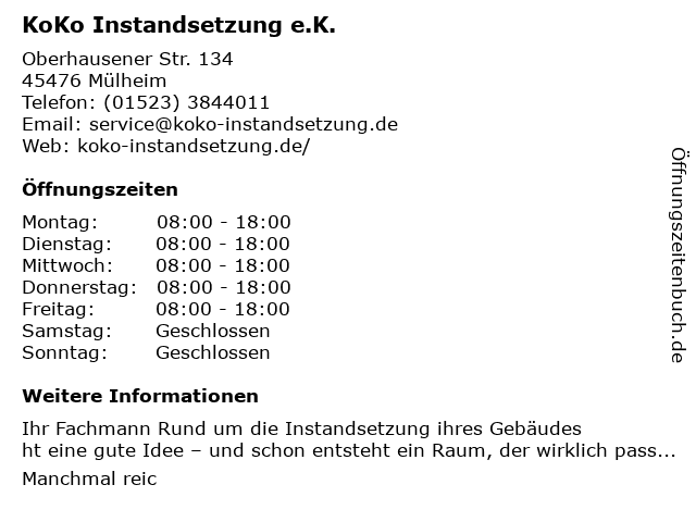 | Öffnungszeiten KoKo Instandsetzung e.K. in Mülheim anzeigen | |