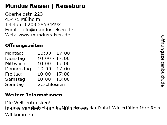 | Öffnungszeiten Mundus Reisen | Reisebüro in Mülheim anzeigen | |