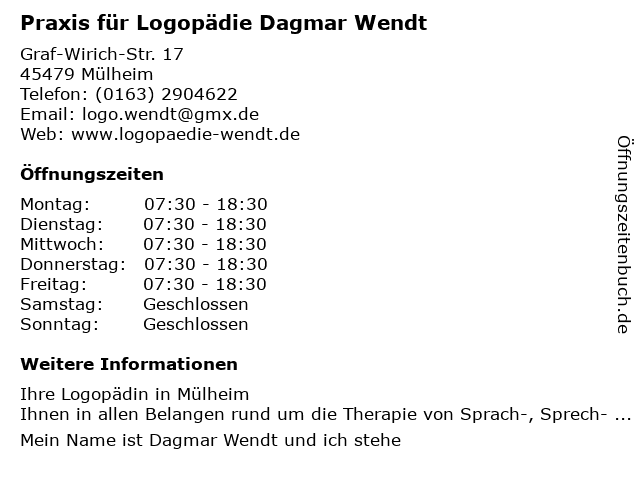 3 Logopädie Mülheim - Serra Ürker | Ceren Can (Entfernung: 1,98 km) Mellinghofer Straße 22a, 45473 Mülheim 4 Sabine Busch-Groeliken Praxis f.Krankengymnastik u. Logopädie (Entfernung: 3,77 km) Mellinghofer Str. 256, 45475 Mülheim 6 |