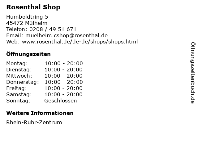 | Öffnungszeiten Rosenthal Shop in Mülheim anzeigen | |