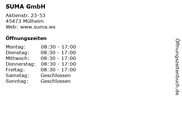 | Öffnungszeiten SUMA GmbH in Mülheim anzeigen | |
