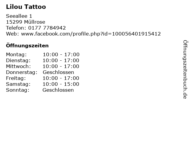 | Öffnungszeiten Lilou Tattoo in Müllrose anzeigen | |
