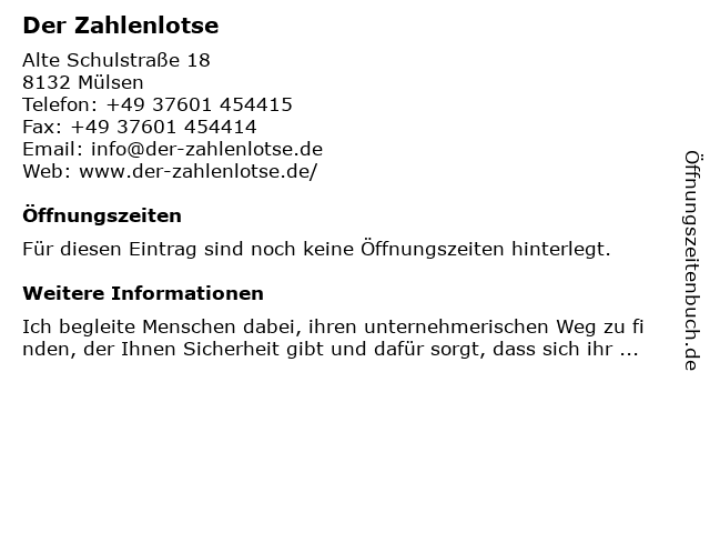 | Öffnungszeiten Der Zahlenlotse in Mülsen anzeigen | |