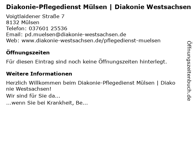 | Diakonie-Pflegedienst Mülsen | Diakonie Westsachsen anrufen | |
