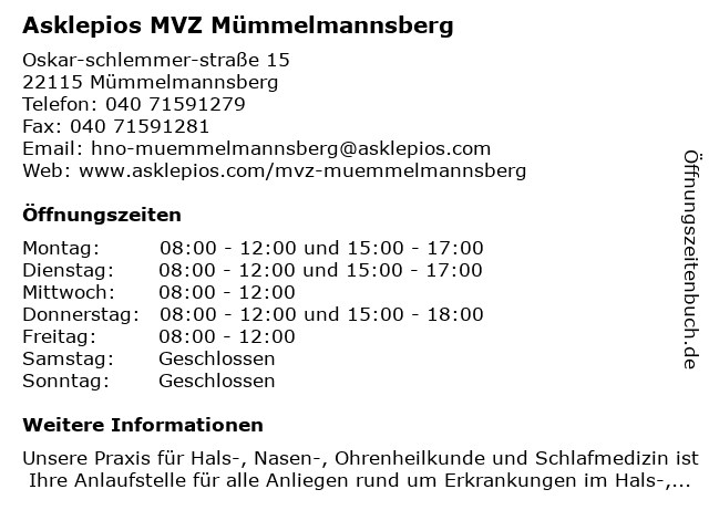 1 Asklepios MVZ Mümmelmannsberg - Praxis für Hals-, Nasen-, Ohrenheilkunde und Schlafmedizin (Entfernung: 0,02 km) Oskar-schlemmer-straße 15, 22115 Mümmelmannsberg 3 MVZ Med. Versorgungszentrum Asklepios Gesundheitszentrum Mitte (Entfernung: 9,60 km) Lohmühlenstr. 5, 20099 Hamburg 4 MVZ Rheumatologie und Autoimmunmedizin Hamburg GmbH (Entfernung: 10,36 km) Mönckebergstraße 27, 20095 Hamburg 5 MVZ Med. Versorgungszentrum Falkenried GbR Standort Winterhude (Entfernung: 10,43 km) Jarrestr. 6 -10, 22303 Hamburg 6 |