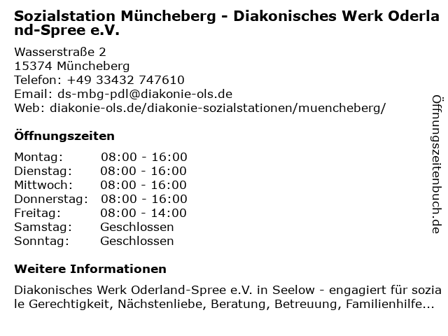 | 2 Diakonisches Werk Oderland / Spree e.V. Sozialstation (Entfernung: 0,01 km) Wasserstr. 2, 15374 Müncheberg 3 Sparkasse Märkisch-Oderland (Geldautomat) (Entfernung: 0,01 km) Ernst-Thälmann-Straße 83, 15374 Müncheberg 4 Landkreis Oder-Spree Strassenverkehrsamt Nebenstelle Fürstenwalde (Entfernung: 15,57 km) Hegelstraße 23 A, 15517 Fürstenwalde 5 Niab-Netzwerk Integrationsassistenz Brandenburg Fürstenwalde/Spree (Entfernung: 15,73 km) Wrietzner Str. 13, 15517 Fürstenwalde 6 |