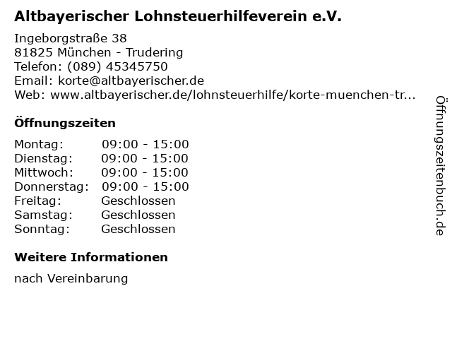 1 3 Altbayerischer Lohnsteuerhilfeverein e.V. (Entfernung: 2,61 km) Wasserburger Landstraße 264, 81827 München - Trudering-Riem 4 Altbayerischer Lohnsteuerhilfeverein e.V. (Entfernung: 3,93 km) Waldperlacher Str. 67b, 81739 München - Ramersdorf-Perlach 6 Altbayerischer Lohnsteuerhilfeverein e.V. (Entfernung: 8,01 km) Tegernseer Landstr. 4, 82024 Taufkirchen |