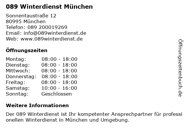 | Öffnungszeiten 089 Winterdienst München in München anzeigen | |