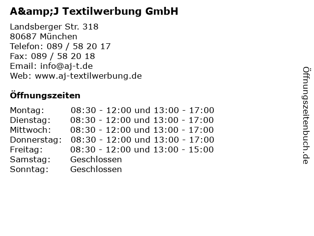 | Öffnungszeiten A&J Textilwerbung GmbH in München anzeigen | |