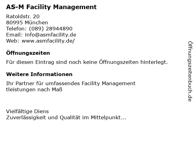 | Öffnungszeiten AS-M Facility Management in München anzeigen | |
